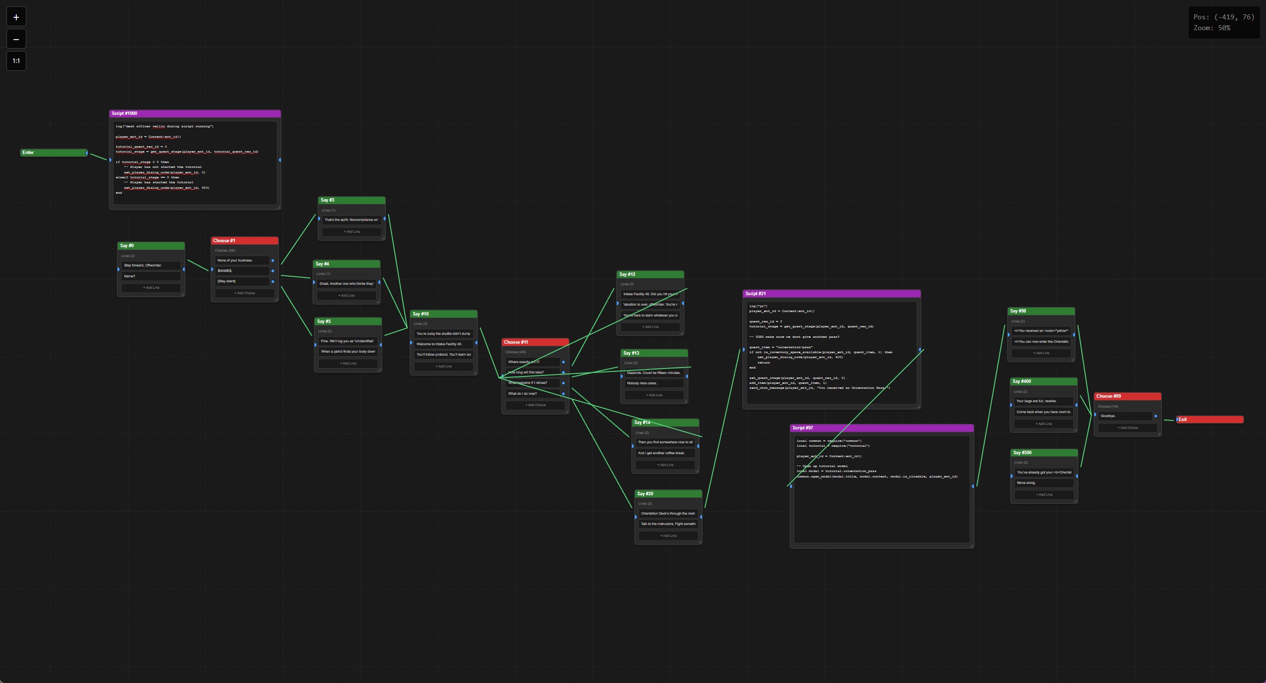 I vibe coded a dialog editor to help me work on more complex conversations. It's built with Dioxus, largely with the help of ChatGPT and Claude. Dioxus is great for building quick UIs and it is nice to stay in the Rust ecosystem, since I have been extracting server code into a shared module which tooling can use. The editor still needs a lot of work though. Node edges and connections are especially difficult to get right. Very basic feature set right now, but it is already helpful for visualizing conversation flow.