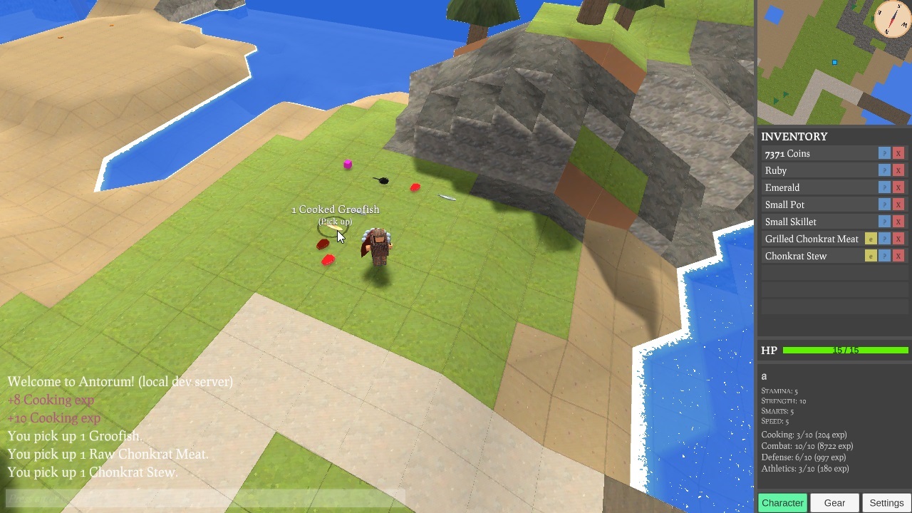With cooking implemented, the game is feeling a lot more interesting. Since monsters can drop ingredients, and players can cook food for combat and recovery, game systems are starting to feed into each other. When I add things like shops and trading, cooking will also be able to contribute to some minor economy. The new interaction stuff was a big blocker for friendly NPCs, shopkeepers, and banks, so I will be tackling those sometime soon.