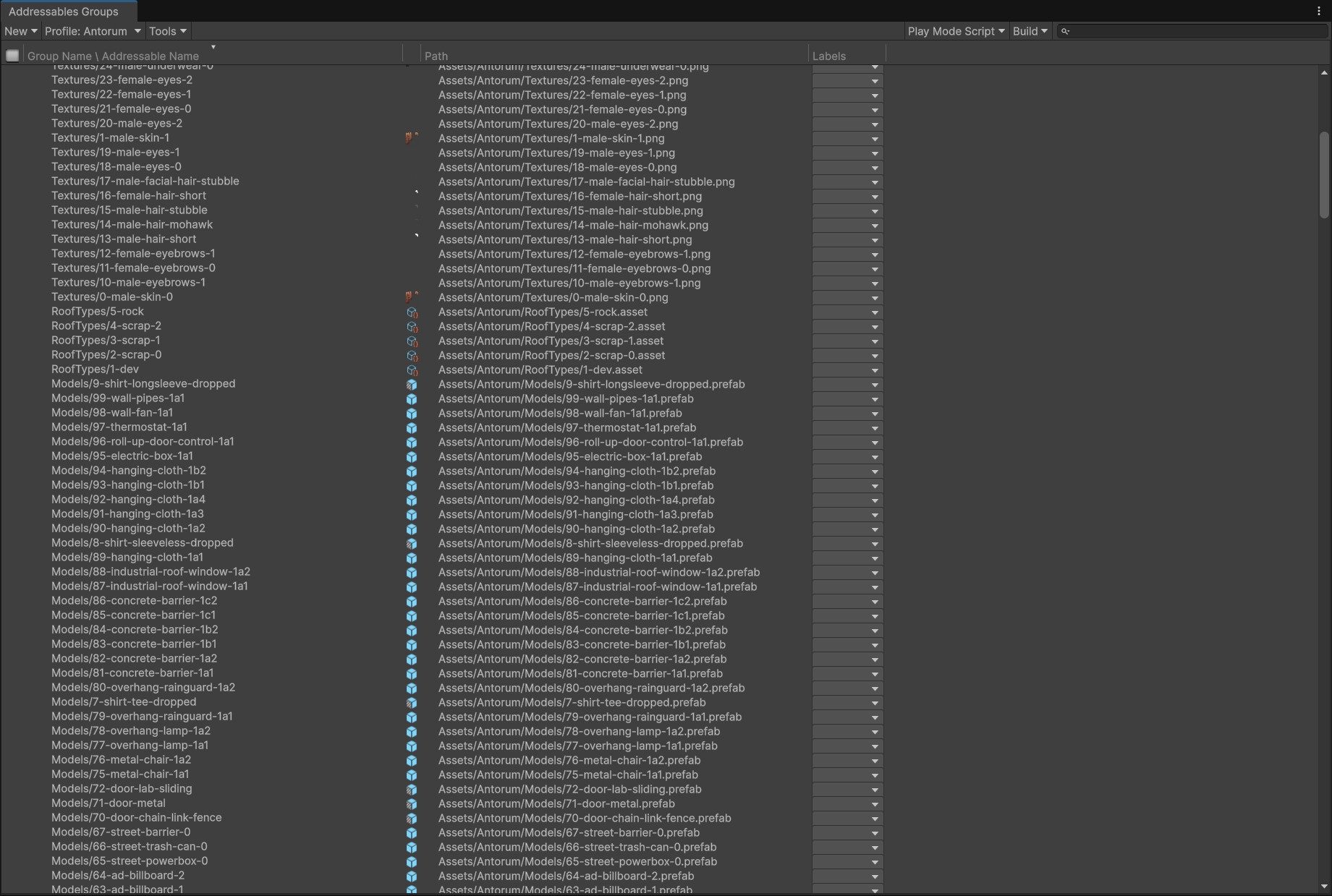 In Antorum, all items, entities, map data like zones, dialog trees, scripts, etc., are entirely data-driven and controlled by the server. While this approach works well for most things, client-side assets such as Models, AudioClips, Textures, and Materials still need to be managed and compiled through Unity. This means the server only references an asset by a numeric ID (like model ID 123), expecting the client to have the corresponding asset prepared.